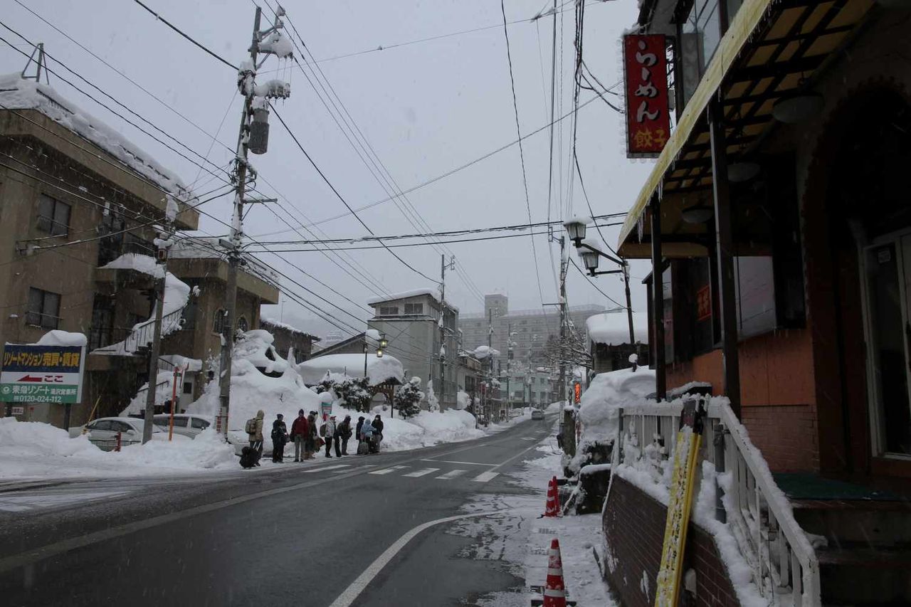 足湯側のバス停にはスキー客と思しき観光客が寒い中バスを待っています。